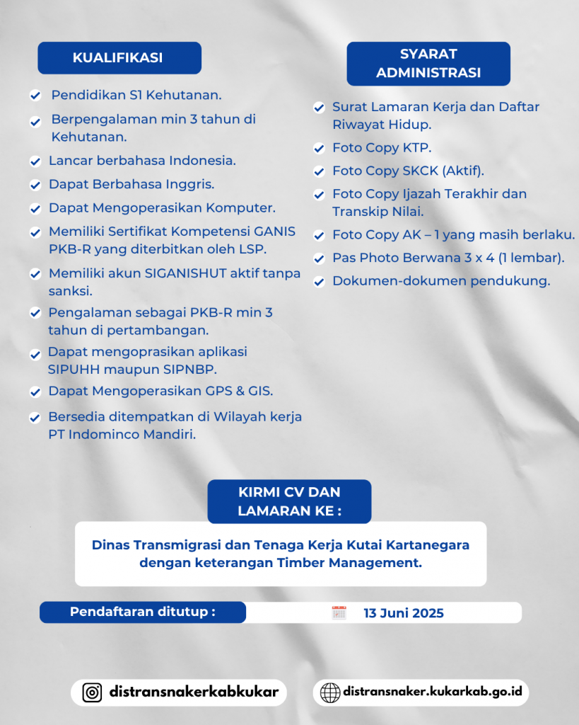 PT Indominco Mandiri membuka kesempatan bagi profesional di bidang kehutanan untuk bergabung sebagai Timber Management. Posisi ini berperan penting dalam pengelolaan sumber daya hutan secara berkelanjutan di area pertambangan kami.