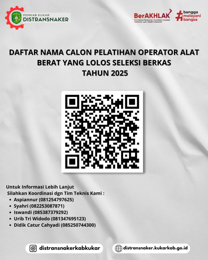 Dinas Transmigrasi dan Tenaga Kerja kutai kartanegara dengan bangga mengumumkan daftar nama calon peserta pelatihan operator alat berat yang telah lolos seleksi administrasi tahun 2025. Seleksi ini merupakan bagian dari upaya kami dalam meningkatkan kompetensi tenaga kerja lokal di bidang alat berat.