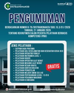 Tenggarong — Dalam upaya meningkatkan kualitas sumber daya manusia serta memperluas kesempatan kerja bagi masyarakat, Dinas Transmigrasi dan Tenaga Kerja (Distransnaker) Kabupaten Kutai Kartanegara resmi membuka Pendaftaran Calon Peserta Pelatihan Berbasis Kompetensi (PBK) Tahun 2026.